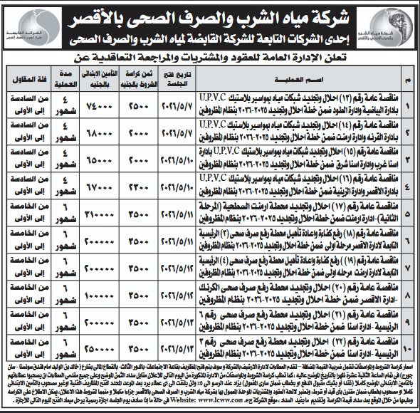 قراءة المزيد📌تعلن شركة مياه الشرب والصرف الصحى بالاقصر عن طرح المناقصات التالية :